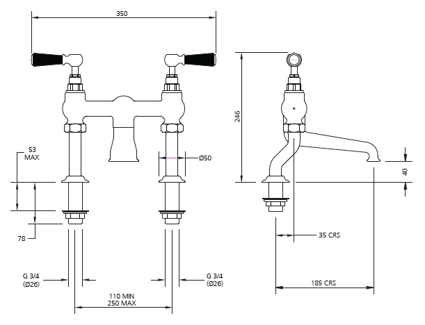 Reach: 185 mmTap distance apart: min. 110 mm to max. 250 mm