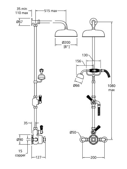 Lefroy Brooks exposed thermostatic shower mixing valve with black ceramic lever handles, riser kit, handset, diverter, eight inch rose and adjustable riser pipe bracket BL 8704