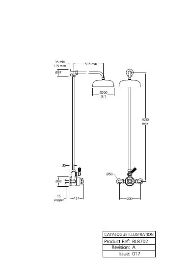Lefroy Brooks exposed thermostatic shower valve with black ceramic lever handles, riser, eight inch rose and adjustable riser pipe bracket BL 8702
