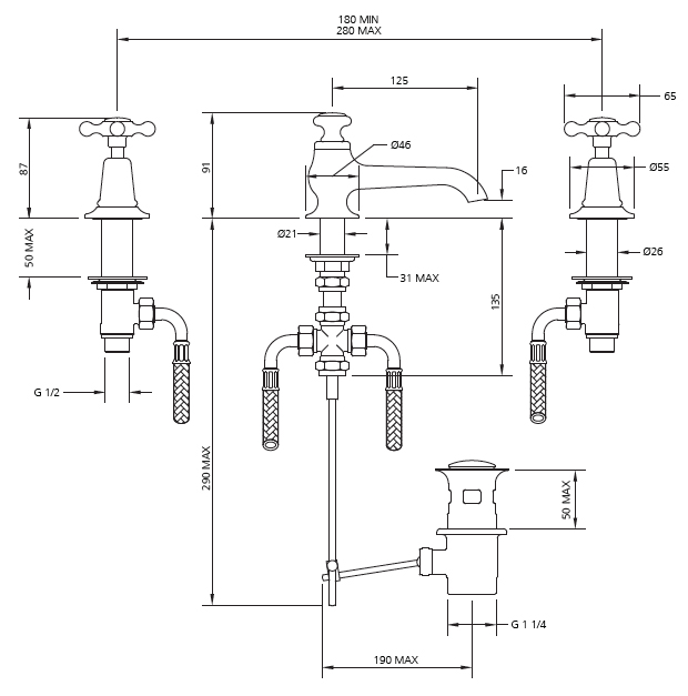 Lefroy Brooks Connaught long spout three hole basin mixer with pop-up waste CH 1224