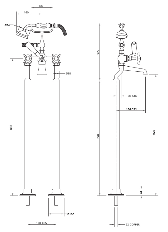 Lefroy Brooks Classic bath shower mixer with standpipes LB 1144. Also available with exteneded legs for more information please contact bathrooms@hollowaysofludlow