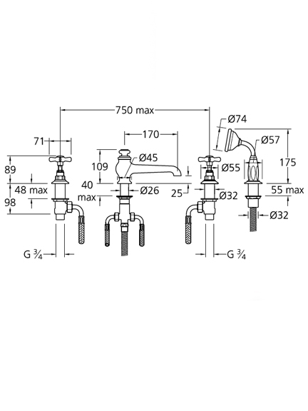 Lefroy Brooks Classic four hole bath tap set with diverter and pull-out hand shower, LB 1250.