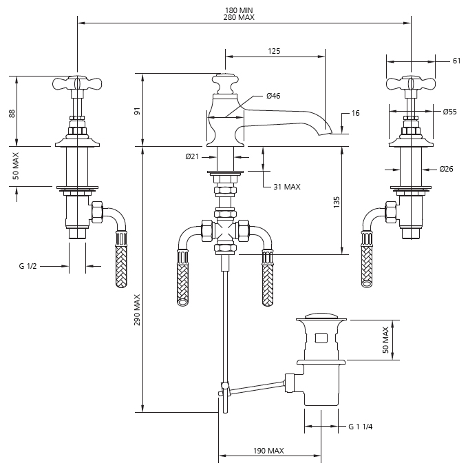 Lefroy Brooks Connaught Three Hole Basin Mixer with Pop-Up Waste LB 1224