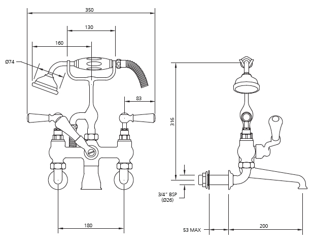 Height: 316 mmWidth: 350 mmReach: 200 mmTap centres: 180 mm