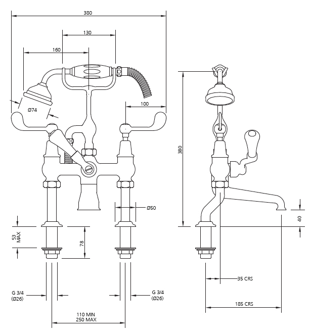 Lefroy Brooks Connaught bath shower mixer with lever handles CL 1100 (three-quarter inch fitting)