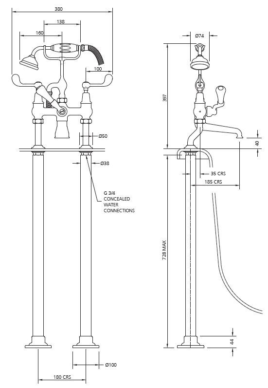 Lefroy Brooks Connaught bath shower mixer with lever handles, standpipe sleeves and adjustable baseplates CL 1145