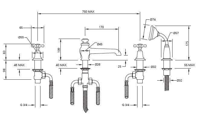 Max. distance apart for taps: 750 mmReach: 170 mm