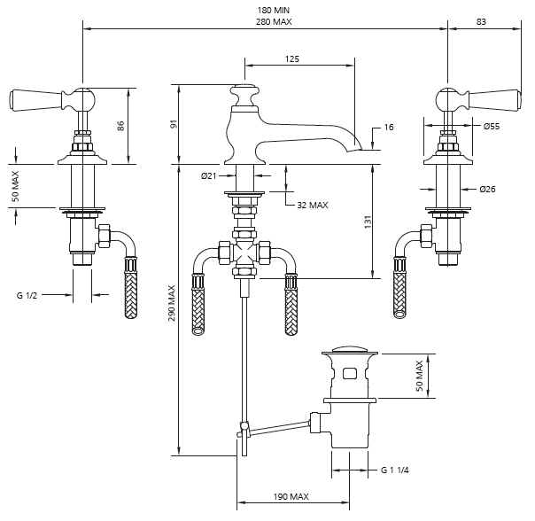 Lefroy Brooks Connaught Three hole Basin Mixer with white levers and Pop-Up Waste WL 1224. Also available in black BL1224 for more infomation please email bathrooms@hollowaysofludlow.com