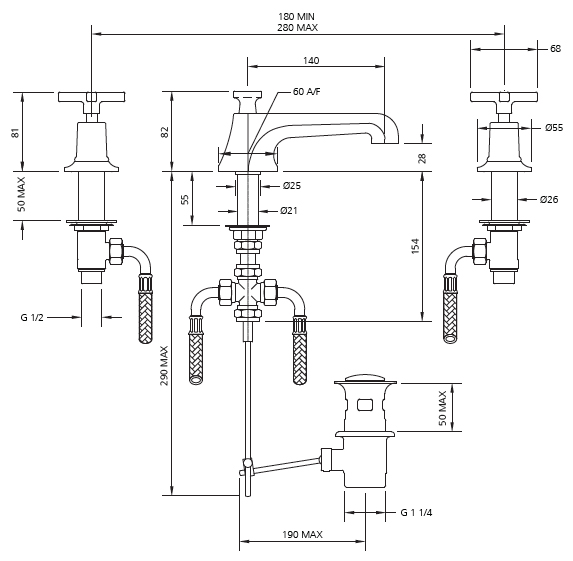 Lefroy Brooks Mackintosh three hole basin mixer with pop-up waste. Crafted to the highest standards this Art Deco styled mixer tap will add class to any bathroom.