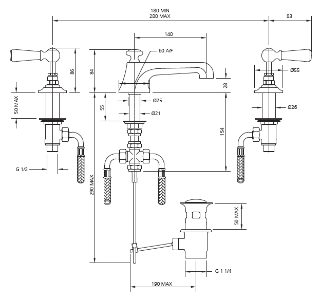 Lefroy Brooks Mackintosh White ceramic lever three hole basin mixer with pop-up waste WL 1228