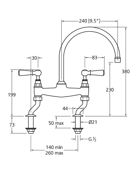 Overall tap height: 380mmHeight to spout: 230mmSpout reach: 240mmHandle width: 260mm